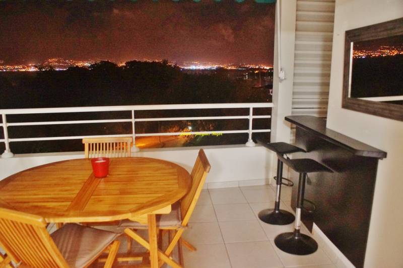 La très grande terrasse avec vue sur la baie de Fort de France se situe face au nord, et ne reçoit pas le soleil directement .